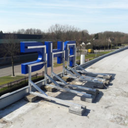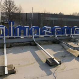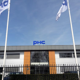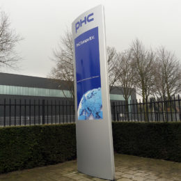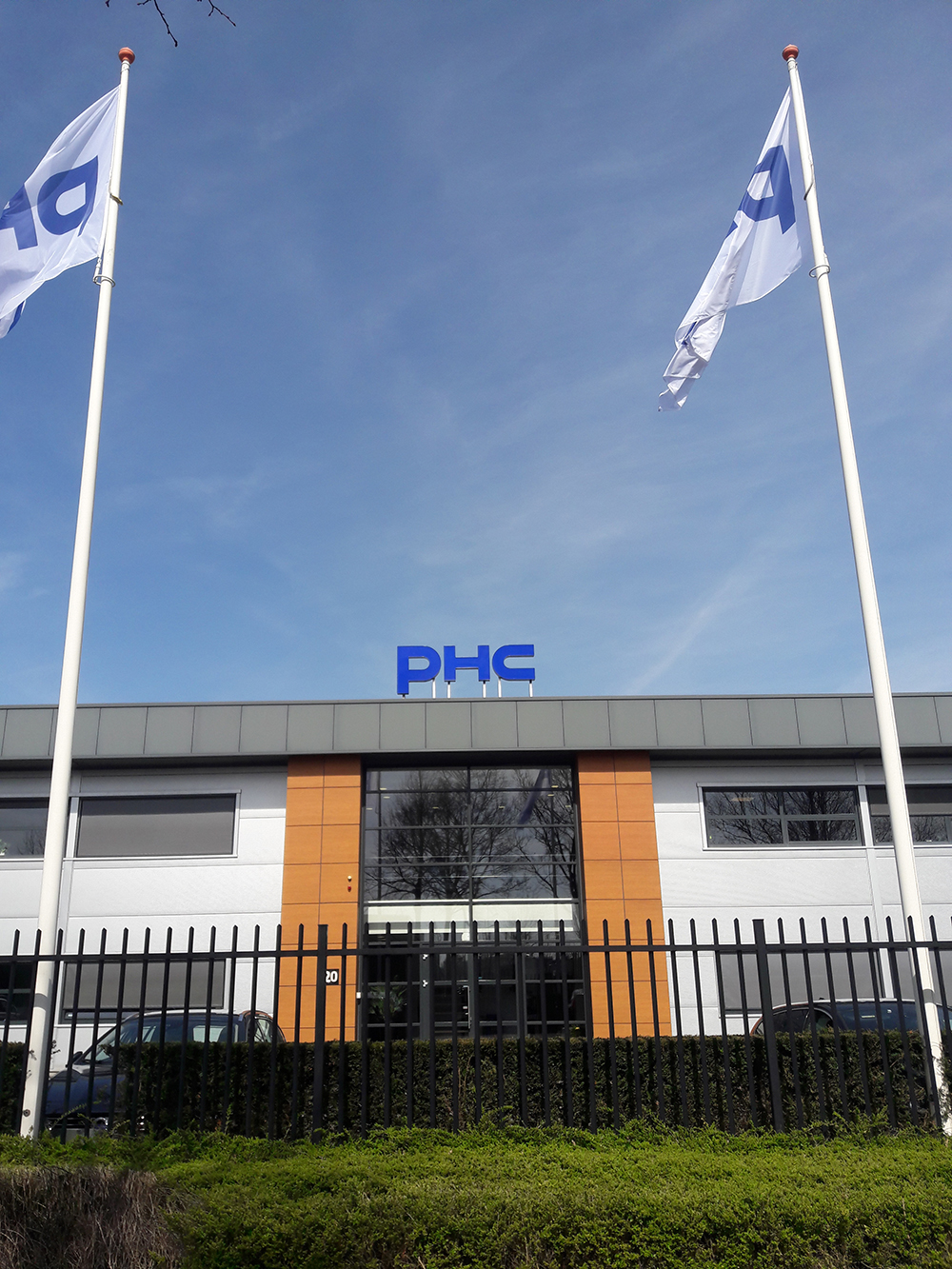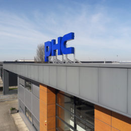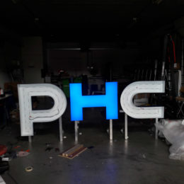 Voor PHC Europe BV hebben wij de naamsverandering op de gevel gerealiseerd. De oude verlichte Panasonic letters zijn verwijdert en daarvoor in de plaats zijn aluminium verlichte doosletters teruggekomen van 1 meter hoog. De zijkanten van de letters zijn in de juiste blauwe kleur gespoten, de voorzijdes van de letters zijn beplakt met blauwe lichtdoorlatende folie. Ook verzorgden wij het nieuwe aluminium dakframe, en de aanleg van de stroomtoevoer.