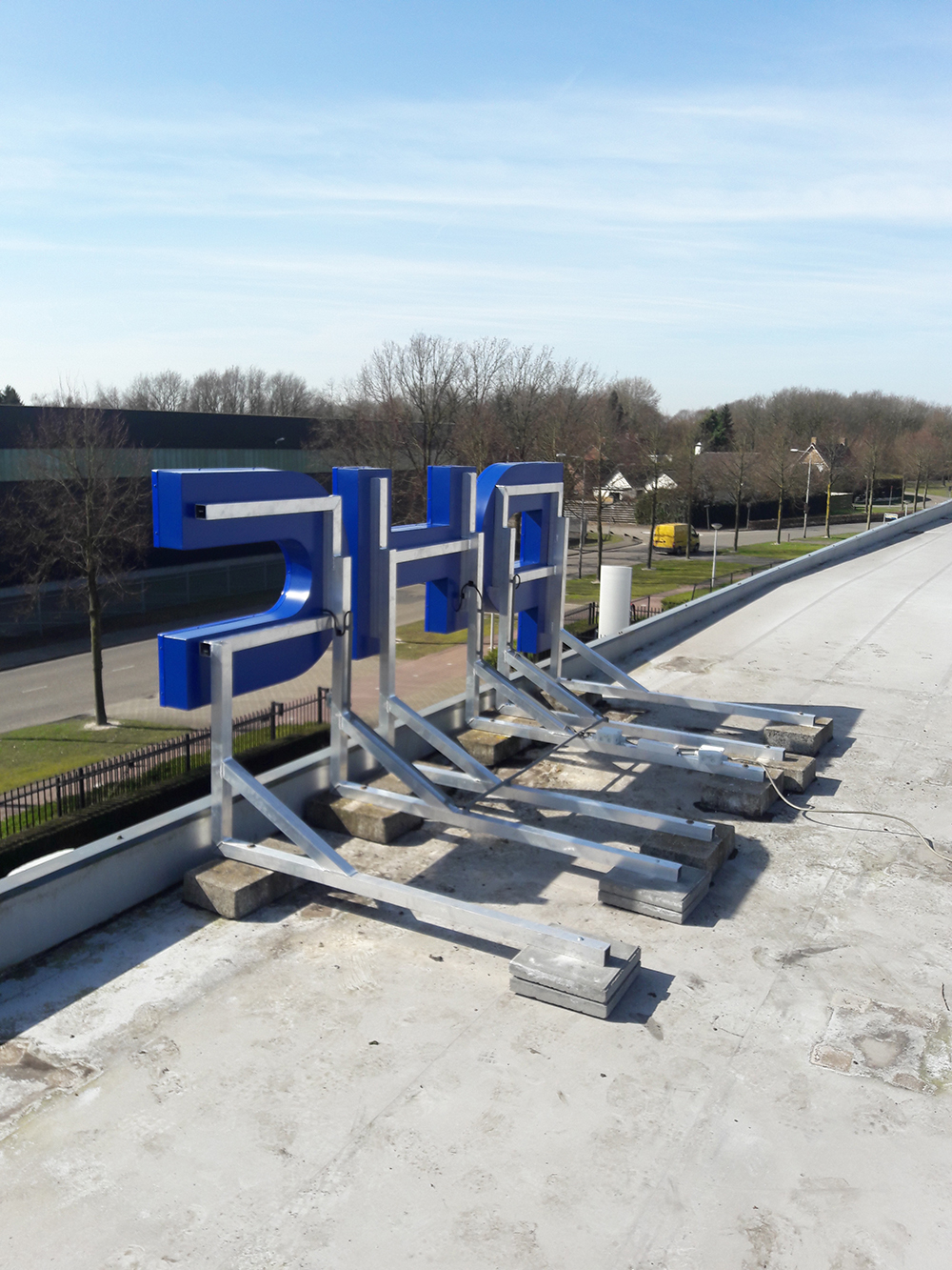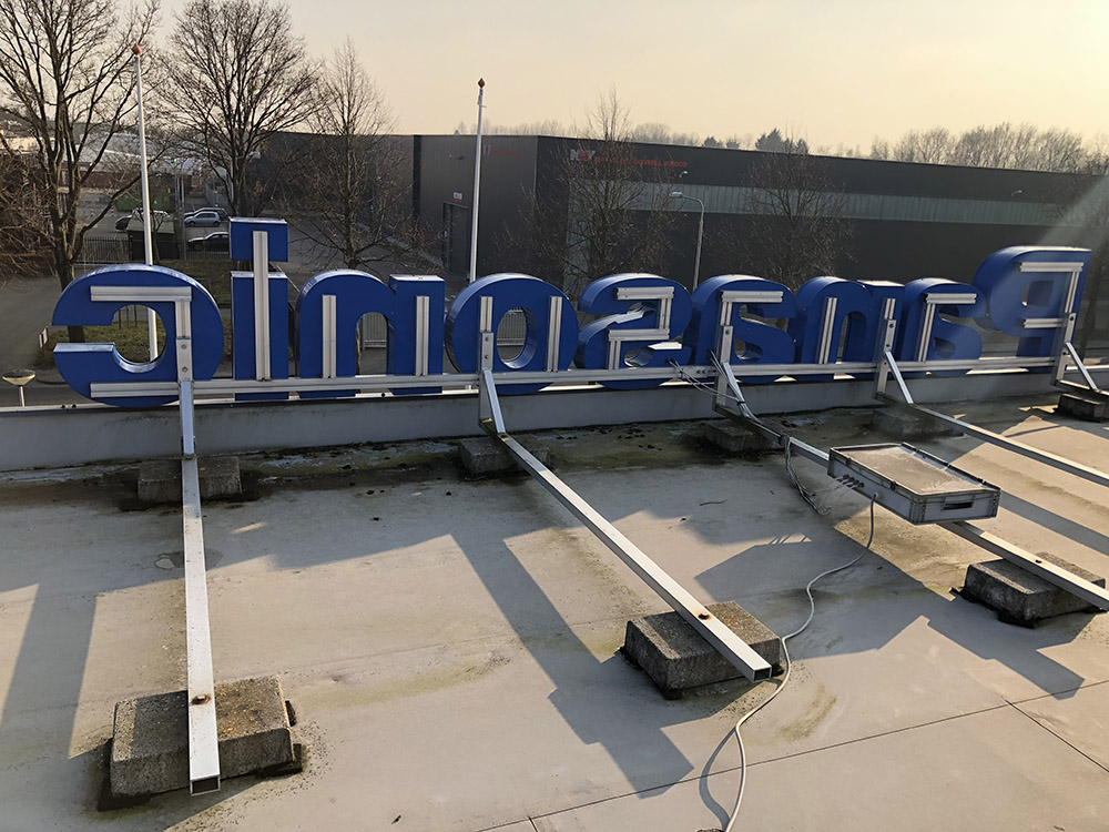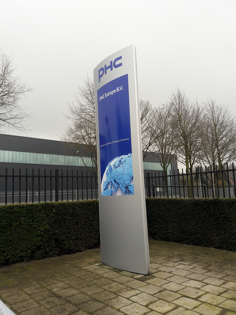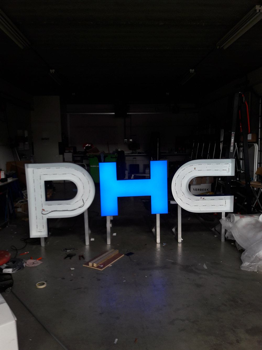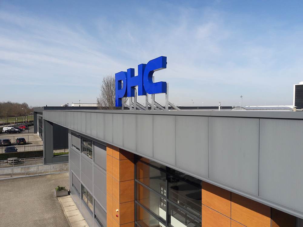 Voor PHC Europe BV hebben wij de naamsverandering op de gevel gerealiseerd. De oude verlichte Panasonic letters zijn verwijdert en daarvoor in de plaats zijn aluminium verlichte doosletters teruggekomen van 1 meter hoog. De zijkanten van de letters zijn in de juiste blauwe kleur gespoten, de voorzijdes van de letters zijn beplakt met blauwe lichtdoorlatende folie. Ook verzorgden wij het nieuwe aluminium dakframe, en de aanleg van de stroomtoevoer.